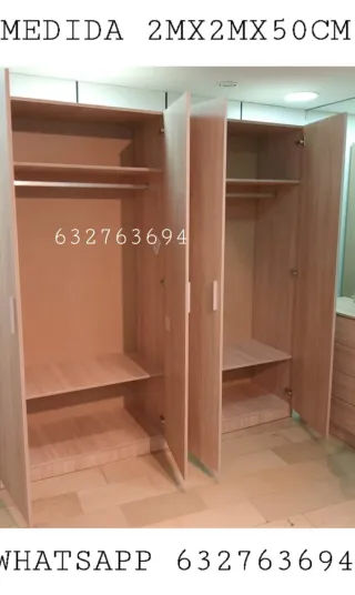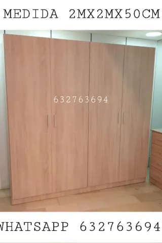 Armario de madera con un diseño moderno y espacioso. Sus medidas son 2 metros de alto, 2 metros de ancho y 50 centímetros de fondo. Nuevo empaquetado! Hacemos envíos y montajes a domicilio contrareembolso. También nos pueden contactar a través de WhatsApp al 632763694 - Medidas: 200cm x 200cm x 50cm. - Precio: 255€. - Contacto: 632763694.