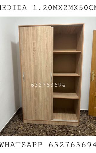 Armario de madera con puertas correderas. Nuevo empaquetado! Hacemos envíos y montajes a domicilio contrareembolso. También nos pueden contactar a través de WhatsApp al 632763694 - Medidas: 1.20m de ancho, 2m de alto y 50cm de fondo. - Interior con barra para colgar y baldas.