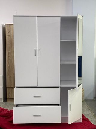 Armario de gran capacidad con un diseño moderno y funcional. Nuevo empaquetado! Hacemos envíos y montajes a domicilio contrareembolso. También nos pueden contactar a través de WhatsApp al 632763694 - Medidas: 2 metros de alto, 2 metros de ancho y 50 cm de fondo. - Incorpora espejos en dos de sus puertas. - Dispone de cajones en la parte inferior para almacenamiento adicional.