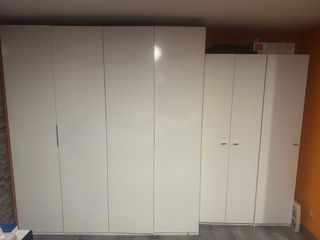 Conjunto de armarios de madera en color blanco. - Diseño moderno y minimalista. - Amplio espacio de almacenamiento. Los más amplios tienen 2 m de altura 50 cm de profundidad y de ancho 1 m 80. Y el otro módulo mide metro 80 40 cm de fondo y 1 m de ancho