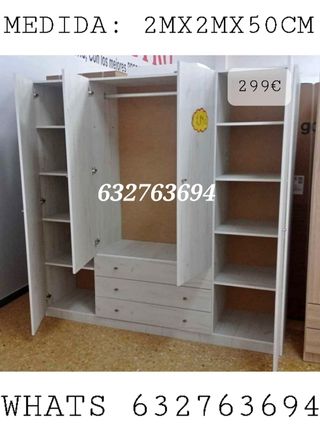 Armario de gran capacidad con un diseño moderno. Nuevo, empaquetado! Hacemos envíos y montajes a domicilio CONTRAREEMBOLSO! Atendemos WhatsApp al 632763694 - Medidas: 2 metros de alto, 2 metros de ancho y 50 cm de fondo. - Fabricado en madera.