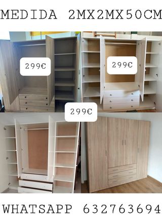 MEDIDA ARMARIO 2 PUERTAS 120€ -alto 190cm x ancho 80cm x fondo 50cm MEDIDA ARMARIO 3 PUERTAS 175€ -alto 190cm x ancho 120cm x fondo 50cm MEDIDA ARMARIO 4 PUERTAS 230€ -alto 190cm x ancho 160cm x fondo 50cm Material: • Estructura: Melamina, un material resistente y de fácil mantenimiento que proporciona una apariencia moderna y elegante. *WHATSAPP 673.033.132*