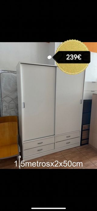 Armario de dos puertas correderas con cajones. Nuevo empaquetado! Hacemos envíos y montajes a domicilio contrareembolso. También nos pueden contactar a través de WhatsApp al 632763694 - Medidas: 1,5 metros de ancho, 2 metros de alto y 50 cm de fondo. - Diseño moderno y funcional.