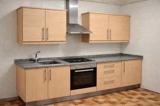 Armarios de cocina con un diseño moderno y funcional. Se puede dividir y vender por partes. Medidas: 40x60 derecha extractor 80x60 izquierda extractor (doble puerta) 40 x 60 encima de nevera 70x 50 debajo de pica Todos con un fondo de 35cm 70 x 40 cajonera - Combinación de madera y metal. - Acabado en tonos beige y marrón.