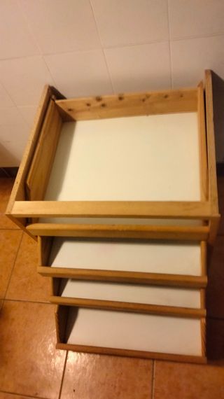 Cajonera de madera para el interior de armario. Es de madera de pino los cajones y laterales son como contrachapado. Se puede ver el envío. Tengo que pesarla y medir bien. Ancho 56 cm. Alto 60cm. Fondo 50'5 cm. Interior de los cajones 44x49x10cm.