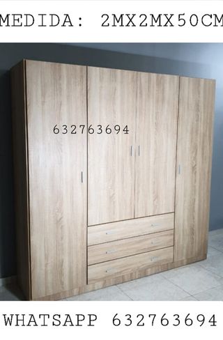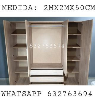Armario de madera con medidas de 2 metros de alto, 2 metros de ancho y 50 cm de fondo. Nuevo empaquetado! Hacemos envíos y montajes a domicilio contrareembolso. También nos pueden contactar a través de WhatsApp al 632763694 - Diseño de cuatro puertas. - Incluye barra para colgar. - Dispone de dos cajones inferiores. - Estantes interiores para organización.