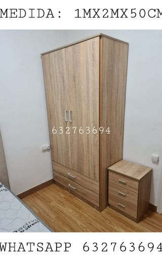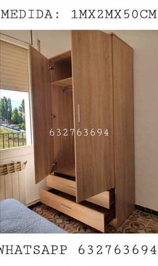 Armario de madera con un diseño moderno y funcional. Sus medidas son 1 metro de ancho, 2 metros de alto y 50 centímetros de fondo. Nuevo empaquetado! Hacemos envíos y montajes a domicilio contrareembolso. También nos pueden contactar a través de WhatsApp al 632763694