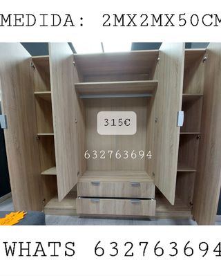 Armario de madera con un diseño moderno y funcional. Nuevo empaquetado! Hacemos envíos y montajes a domicilio contrareembolso. También nos pueden contactar a través de WhatsApp al 632763694 - Medidas: 2 metros de alto x 2 metros de ancho x 50 cm de fondo. - Incluye dos cajones en la parte inferior.