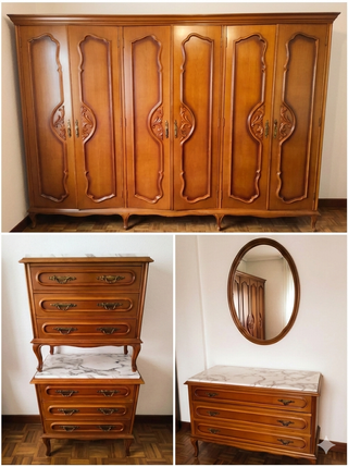 ESCUCHO OFERTAS Dormitorio completo MADERA MACIZA y MÁRMOL. Por reforma, prefiero que alguien los aproveche y les dé una segunda vida. Calidad excepcional. Ideal casas rurales, restaurar, nogal real calidad Incluye: Armario 6 puertas (gran capacidad, interior vestido). 2 mesitas y una comoda con encimera de mármol impecables. Espejo ovalado a juego. Muebles robustos y elegantes, perfectos para usar tal cual o para restaurar. Precio: 375€ (negociable si te encargas de todo). Recogida en mano en Granada capital. NO ENVÍO por volumen/peso. Ayudo, facil aparcar, ascensor y posiblidad de portes economicos aparte. ¡Aprovecha piezas eter