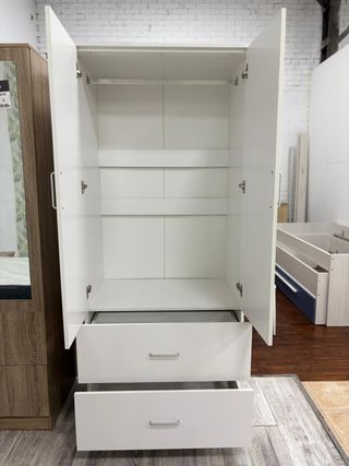 Armario de dos puertas con espejo y dos cajones inferiores. Un mueble práctico y elegante para tu habitación. - Acabado en madera y blanco. - Puertas con tiradores metálicos. - Cajones con guías metálicas. - barra para colgar ropa MEDIDAS: -Alto: 190 cm -Largo: 81cm -Ancho: 50 cm . Pago en casa . Entrega a domicilio llámanos al 66.79.63.1.3.6