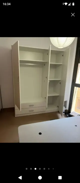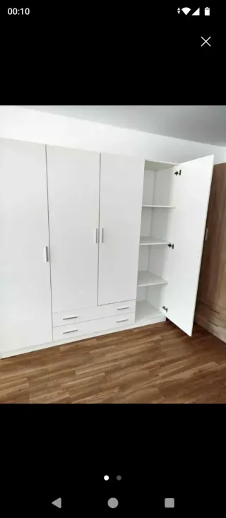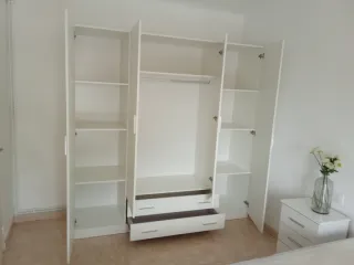 Armario de madera con acabado en blanco. Dispone de varias baldas y espacio para colgar ropa. Vendemos armarios de 4, 3 y 2 puertas, de 3 tipos de colores: Blanco, cambrian y ártico. Envío y montaje incluído. Productos de muy buena calidad y a precios muy buenos. Productos 100% de españa. También vendemos canapés de diferentes medidas. Mesas de comedor de cristal con 6 sillas, y dos tipos de colores: Blanco y negro. También vendemos mesas de centro, mesitas de noche, cómodas, cabezales, almohadas y demás.