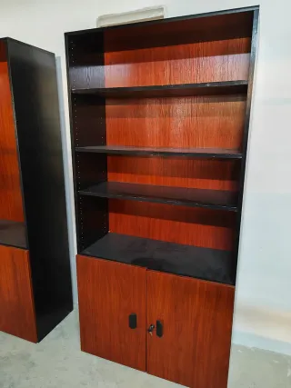 Vendo estanterías de oficina en acabado madera oscura con estructura negra, robustas y funcionales. Ideales para despacho, sala de reuniones o archivo. - Baldas superiores para libros o carpetas. - Armario inferior con puertas y cerradura. - Gran capacidad de almacenaje. - Estructura sólida. - Marcas de uso normales. 📚 2 unidades disponibles 💰 Precio por unidad o pack 📍 Recogida en mano 🚫 No envío