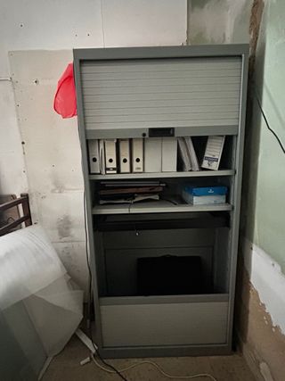 Conjunto de 3 armarios metálicos archivadores con puertas de persiana. La unidad 200€, todos 500€. - Estructura principal metálica. - Puertas enrollables de persiana con cerradura - Se venden con las carpetas archivadoras Oficina, escritorio, silla, mesa, archivador, flexo, balda