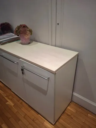 Armario bajo Presto Venere de color blanco. Ideal para guardar archivadores bajo llave. Dos puertas con tiradores plateados. Cerradura con llave incluida. Tiene menos de dos años de uso.