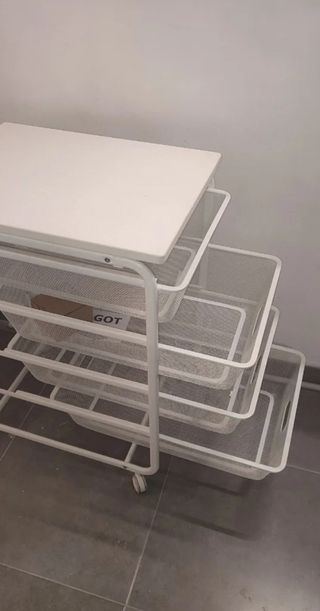 Módulo archivador de metal blanco con ruedas. Cuatro cajones de rejilla metálica. Incluye Bandeja Superior. En perfecto estado. Cajonera