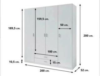 ☎️ 680*558*196 Armario ropero blanco de 4 puertas totalmente nuevo, ideal para dormitorio de matrimonio, juvenil o habitación de invitados. Diseño moderno y elegante. Incluye cajones inferiores de gran capacidad 🆕 Estado: Nuevo, sin uso 📐 Medidas Alto: 190 cm Largo: 160 cm Ancho: 50 cm