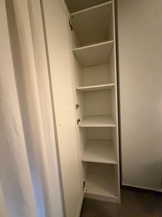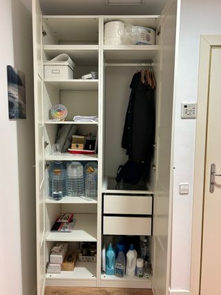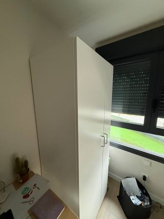 Armario alto de color blanco. Muy versátil, tanto para habitación como para otros espacios de la casa. Tiene dos baldas superiores y colgador para unas 6 chaquetas. Le faltan los cajones de la parte de abajo. Yo lo usaba para guardar cajas. Lo entrego desmontado. - Diseño moderno y funcional. - Amplio espacio de almacenamiento interior.