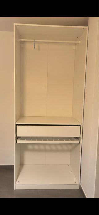 Armario blanco del Ikea, en perfecto estado, sin puertas. Incluye barra, balda, cajón y para colgar pantalones. Se vende desmontado.