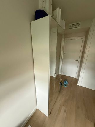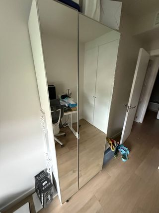 Armario de la serie PAX con unas medidas de 75x35x201 cm. Incluye cinco baldas interiores para organizar tus pertenencias. - Puertas de espejo. - Estructura robusta. con ÅHEIM puertas, espejo, 50x195 cm y 25x195 cm solo recogida en Madrid