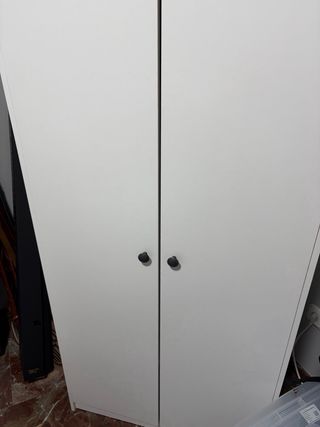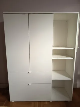 Armario de almacenamiento en color blanco, en muy buen estado. Dispone de varias baldas interiores amplias que permiten organizar ropa, zapatos, libros u otros objetos. Diseño sencillo y moderno, fácil de combinar con cualquier estilo de decoración. Puertas firmes con bisagras en buen estado. Ideal para dormitorio, despacho, oficina o trastero. Limpio y listo para usar.
