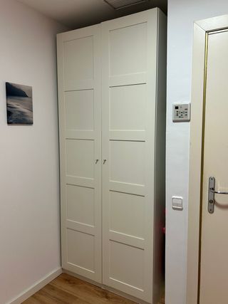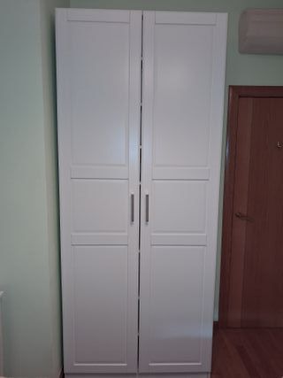 Armario de tres puertas de Ikea. Dos compartimentos: uno de 80cm y otro de 60 cm. Baldas en el estrecho y barra en el ancho. Tengo 2 unidades que se venden por separado. - Amplio espacio de almacenamiento. - Tiradores integrados.