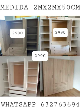 Armario de madera con medidas de 2 metros de alto, 2 metros de ancho y 50 cm de profundidad. Presenta un diseño moderno y funcional. Nuevo, empaquetado! Hacemos envíos y montajes a domicilio CONTRAREEMBOLSO! Atendemos WhatsApp al 632763694 - Amplio espacio interior con baldas y cajones. - Puertas abatibles.