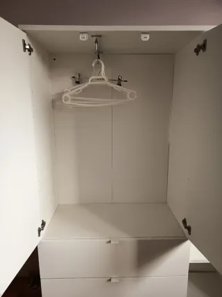 Armario de almacenamiento con acabado blanco. Dos puertas con barra que se desliza para perchas. Dos grandes cajones inferiores. Baldas . Medidas : alto 140/ ancho 105 / fondo 37