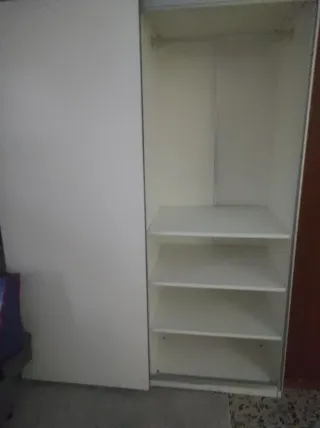 Armario de la marca Ikea, con un diseño moderno y funcional. Con 2 puertas correderas. 2 armarios de 75×200x50 de fondo. En buen estado,solo que está despegado la parte de en medio,por detrás. Pero se puede solucionar. - Estructura principal de color blanco. - Puerta corredera. - Interior con barra para colgar y baldas.