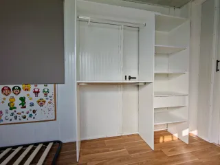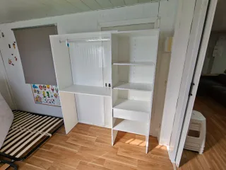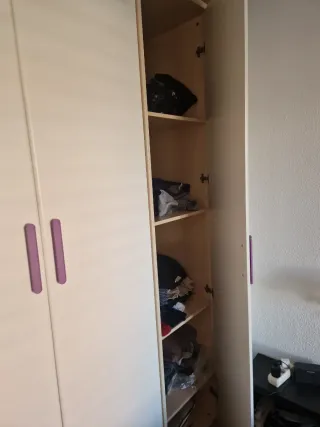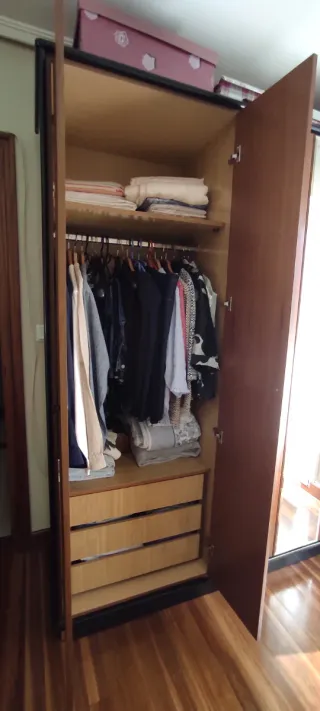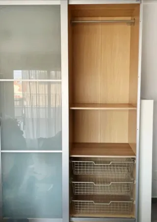 Totalmente equipado con dos módulos (uno doble y otro estrecho), listo para usar y compatible con todas las posibilidades PAX de Ikea. Módulo grande (doble): • Barra para colgar ropa • 2 cajones amplios • 1 cesta extraíble • 2 baldas 2 baldas Módulo estrecho: • Barra para colgar • 2 baldas • 1 cajon • 1 cesta 🚪 Puertas: modelo TYSSDAL de IKEA 👉 Las puertas son opcionales y negociables. Todo en buen estado y funcionando perfectamente