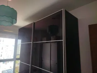 Armario ropero con puertas correderas de cristal. - Diseño moderno y elegante. - Amplio espacio de almacenamiento. Perchas, colgador de pantalones, baldas, cajones y cestas. IMPORTANTE: el desmontaje, montaje y transporte corre a cuenta del comprador. Si se llegará a algún acuerdo quizás nosotros podríamos ayudar algo en el desmontaje, pero nada seguro.