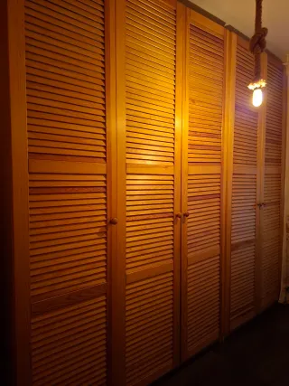 Conjunto de muebles de madera con un ancho total de 250cm. Fondo 60cm Alto 235cm aprox - Diseño con puertas de lamas. - Tiradores redondos. - Acabado en tono madera natural. - Son 3 módulos. El primero 50cm, y los otros dos de 1m cada uno. - Tienen barra y baldas y mucha capacidad.