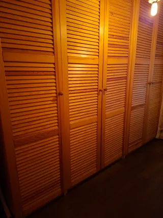 Estructura de armario de pino diseñada para empotrar. Ojo!!️ Lo que se está ofreciendo es solo la estructura de dentro para adaptar al hueco que tú tengas. Es toda la estructura interior necesaria para un armario empotrado, no necesitas más. Toda la madera de la estructura que soporta las baldas es de pino macizo, las baldas barnizadas también. Desmontado facil para transportar. Si te valen las puertas lo podemos hablar.. Mide 198cm de altura hasta la balda de arriba x 98 de ancho x 60 de fondo. Hay que recoger antes del viernes noche, me voy fuera de Madrid. - Material de madera pino natural. - Muy buen estado