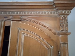 Elegante armario de madera con un diseño clásico y acabados detallados.Puertas superiores con apertura con base desplazable y un cajon.Parte inferior con dos puertas y una balda - Puertas superiores con apertura. - Dos puertas inferiores con tiradores ornamentados. - Cornisa superior decorativa.