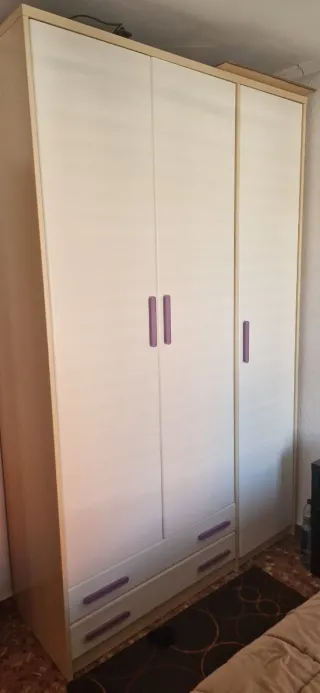 Armario de tres puertas y dos cajones amplios. - Tiradores de color morado. - Acabado en blanco y madera. Parte 2 puertas con barra para colgar ropa y balda superior, en la parte inferior dos grades cajones. En la puerta lateral 5 baldas. Se vende junto a comoda de 9 cajones a juego precio 220€. Precio conjunto 500€