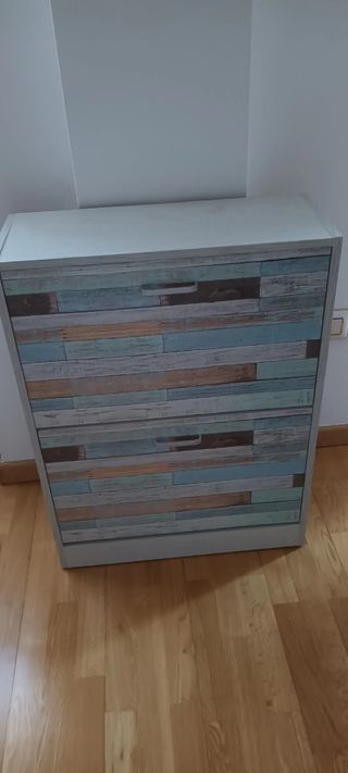 Conjunto de muebles para habitación juvenil con un diseño moderno y original. - Diseño de lamas de madera en colores variados. - Dos cajones con tiradores integrados. - Armario dos puertas, (BALDAS también incluidas). - Comodas a juego, 4 y 5 cajones. - Zapatero juvenil. TODO SEMINUEVO, IMPECABLE. PRECIO NO NEGOCIABLE.