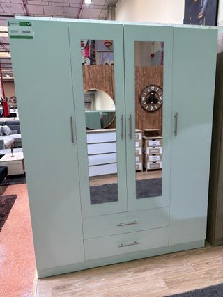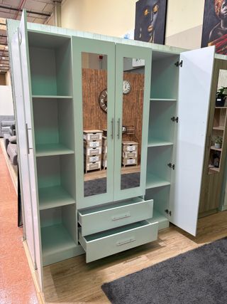 Armario de cuatro puertas con doble espejo central. Diseño moderno y funcional. - Acabado en color verde y blanco. - Puertas con tiradores plateados. - Amplio espacio interior con baldas. - Dos cajones inferiores.