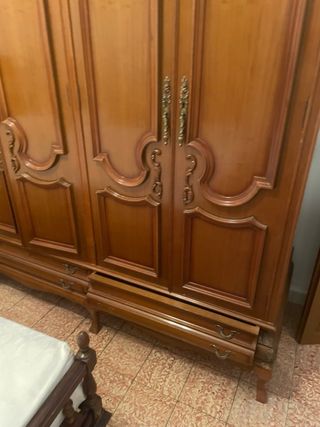 Armario de madera con un diseño clásico y elegante. - Tres puertas. - Tiradores dorados. - Molduras decorativas. Sofá, sillón, butaca, mesa, mesa de centro, mesa auxiliar, sillas, estantería, librero, televisor, mueble de TV, alfombra, cortinas, persiana, cojines, lámpara, lámpara de pie, cuadro, espejo, reloj, aparador, vitrina, chimenea, equipo de sonido