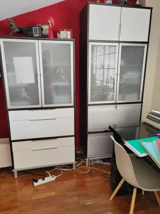 Se venden 3 armarios bajos de oficina con puertas persiana correderas, color haya con puertas gris oscuro. Están en buen estado y cuentan con llave de cierre. Muy prácticos para almacenar documentación, material de oficina o archivo. Medidas (cada armario): • Alto: 135 cm • Ancho: 140 cm • Fondo: 46 cm Se entregan en Tàrrega. Se pueden ver sin compromiso. Se ayudan a cargar si es necesario. PRECIO: • 69€ por unidad • 190€ los 3 juntos