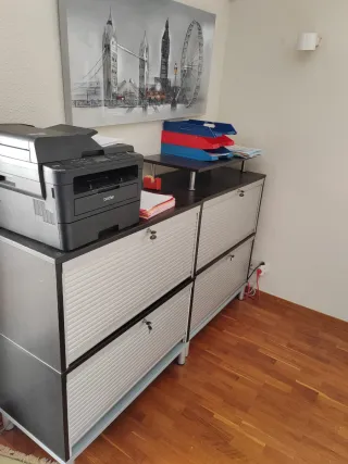 Mueble de oficina o almacenamiento con un diseño moderno, elegante y funcional y gran capacidad interior. - Puertas tipo persiana que se deslizan suavemente con una elegante imitación de madera clara. - Incluye llave para mayor seguridad. - Estructura robusta de metal. - Ruedas con freno para poderlo transportar con facilidad y poderlas bloquear para mayor seguridad. SE ENTREGA EN VILANOVA I LA GELTRÚ (calle Providencia) hasta el 20 de marzo, después de esa fecha se recogerá en Barcelona. Fácil de recoger porque está en un bajo a pie de calle. NO NEGOCIO EL PRECIO.