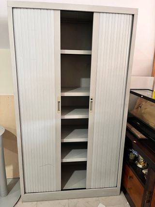 Armario metálico con puerta tipo persiana, ideal para organizar tu espacio de oficina. Con dos baldas metálicas y tapa de madera. En muy buen estado. En el catálogo hay otra algo más ancho y más bajo, echa un vistazo. - Acabado en color gris y detalles en beige. - Combina materiales de metal y madera. SOLO VENTA EN PERSONA EN LA ZONA DEL RASTRO DE MADRID HASTA EL 13 DE FEBRERO