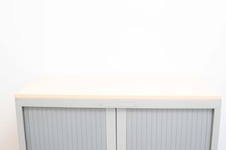 Armario de oficina con puertas de persiana y superficie de madera. - Estructura principal de metal. - Encimera de madera. - Puerta de persiana enrollable.
