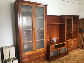 Librería exclusiva neoclásica de madera Máxima dividida en 3 cuerpos separables, vitrina con puertas y baldas de cristal, un cuerpo medio de TV con cajones y puertas correderas y por otro lado un cuerpo final con cajones, puertas inferiores y una puerta corredera de persiana que tapa dos huecos de baldas completas. Medidas en cm: Armario de vitrina: 204 alto x 105 ancho x 39 fondo. Cuerpo central: 175 alto x 101 ancho x 56. Armario lateral: 175 alto x 105 ancho x 39 fondo. Todo el conjunto: 311 largo y 204 en su parte mas alta. Tiene algunos roces, alguna abolladura; todas prácticamente imperceptibles. Si tu TV es más grande se pueden separar