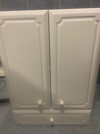 Columna. Armario auxiliar de pared para baño con varias opciones de colocación. Compuesto por 2 módulos: 1 Puerta con cristal translúcido con 1 balda interior: 40 cm ancho x 45 cm alto 1 Puerta opaca con 1 balda interior de 40 cm de ancho, 60 cm de altura y 1 cajón de 15 cm de altura Si lo colocas en columna tiene 120 cm de altura, 40 cm de ancho y 20 cm de fondo. Mucha capacidad de almacenaje y ocupa poco espacio. En muy buen estado Tiene 2 anclajes para sujetar a la pared Fácil de colgar. Incluyo los soportes para colgarlo y los tirafondos Recogida en Barakaldo Centro