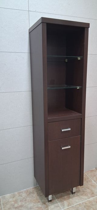Armario columna para baño en color wengué. Cuenta con dos estantes de cristal y dos cajones. - Diseño moderno y funcional. - Patas metálicas para mayor estabilidad.