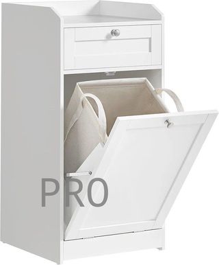 Este mueble de lavandería en MDF blanco mide 78L x 38P x 90A cm y ofrece dos cestos abatibles para ocultar la ropa sucia, con bolsas plegables fáciles de transportar. Incluye dos cajones para pequeños accesorios y una superficie para decoraciones. La capacidad de peso total es de 51.8 kg (9 kg por cajón, 10 kg por cesto). Equipado con un dispositivo anti-vuelco para garantizar estabilidad y seguridad. Montaje requerido. El paquete incluye: 1 x Mueble portabienchería y 1 x Manual. Diseño elegante con puertas de listones y manijas redondas para un toque contemporáneo.