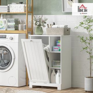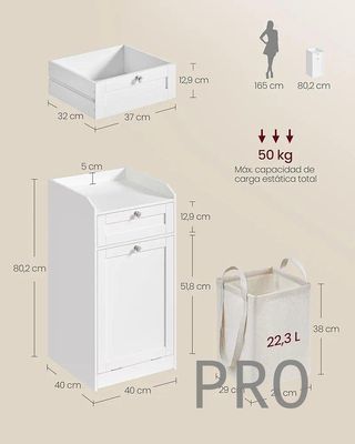 CESTO PORTABIANCHERIA: Este mueble de baño incluye un cesto basculante extraíble de tela con asas, para un fácil transporte de la colada. MUCHO ESPACIO: Optimiza el espacio con tres compartimentos laterales y una superficie superior para detergentes y accesorios. FLEXIBLE: La estantería ajustable en 3 niveles se adapta a objetos grandes o pequeños. SEGURO Y ESTABLE: Equipado con un sistema anti-vuelco, la estructura de MDF de alta calidad soporta hasta 69 kg. DIMENSIONES: 60L x 38P x 86A cm. Capacidad de peso: 13.6 kg por compartimento, 9 kg para el armario. Montaje requerido.