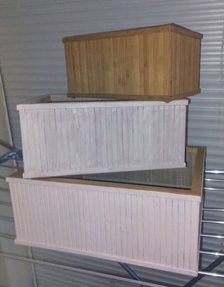 Tres bonitas cajas de almacenaje, ideales para organizar cualquier espacio. Están en muy buen estado. - Dos cajas pintadas de rosa deslavado con un diseño elegante y sencillo. - Una caja de bambú de color marrón natural. - Perfectas para guardar objetos pequeños, útiles para el baño o como elemento decorativo en habitacion infantil o armario. - Están pintadas con pintura a la tiza y barnizadas. - Tienen forro para mejorar la estética si se desea.