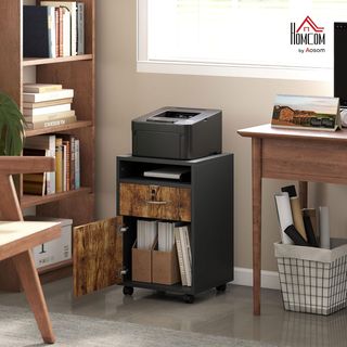 Mueble de oficina con cajón, armario y estante abierto para organizar material de oficina y documentos. Equipado con cerradura y 2 llaves para proteger documentos importantes. Fácil de mover gracias a 4 ruedas giratorias, de las cuales 2 tienen frenos. Fabricado en aglomerado de alta calidad para garantizar robustez y facilidad de limpieza. Dimensiones totales: 40L x 35P x 60A cm, capacidad de peso: 25 kg. Incluye 1 mueble y manual de montaje. Adecuado para casa u oficina, también se puede utilizar como mueble para impresora. Montaje necesario.