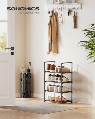 Zapatero SONGMICS de 4 niveles con ligera inclinación visible en una de las barras, no afecta su funcionalidad. Fabricado en tubos de metal resistentes y conectores de plástico duradero, este organizador soporta hasta 10 kg por nivel, ofreciendo espacio para 4 pares de zapatos de hombre o 8 pares de mujer. Medidas compactas de 30 x 42,5 x 71,5 cm, diseño apilable y ahorro de espacio ideal para pasillos, dormitorios o armarios. Montaje sencillo sin herramientas, limpieza fácil con paño húmedo y revestimiento liso que mantiene los zapatos organizados y accesibles.