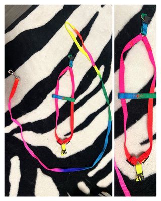 Arnés + correa de colores para mascota ajustable. En buen estado (se vende por falta de uso- está haciendo hueco en el cajón-limpieza de armario) talla única ajustable sin marca.